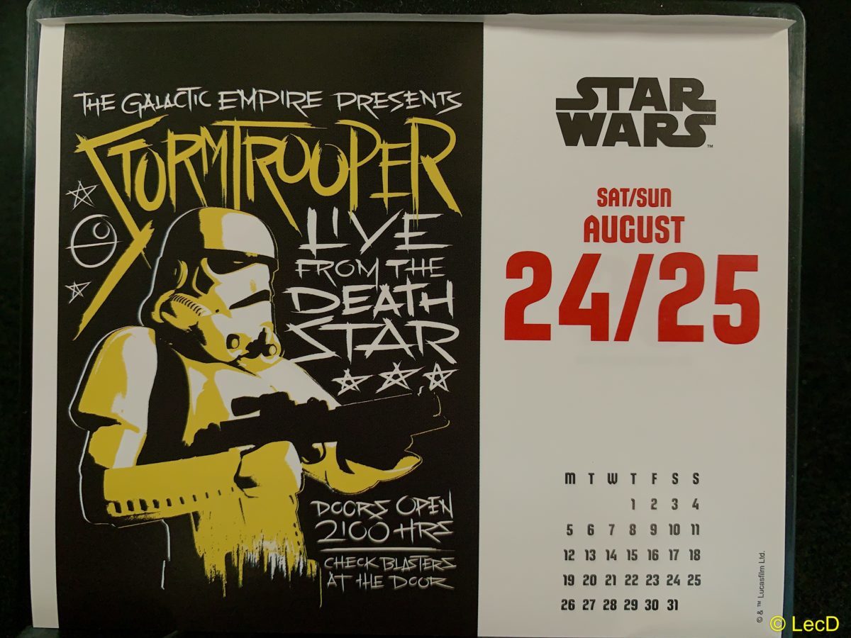 こんにちは。マスター・テッドです。 今日は8月24日 土曜日。明日25日の分も合わせて紹介だ! 週末もがんばって参りましょう。 今日のスター・ウォーズ カレンダー画像はこれ。 ストームトルーパー! ライブ告知ですなあ。 会場はデス・... -