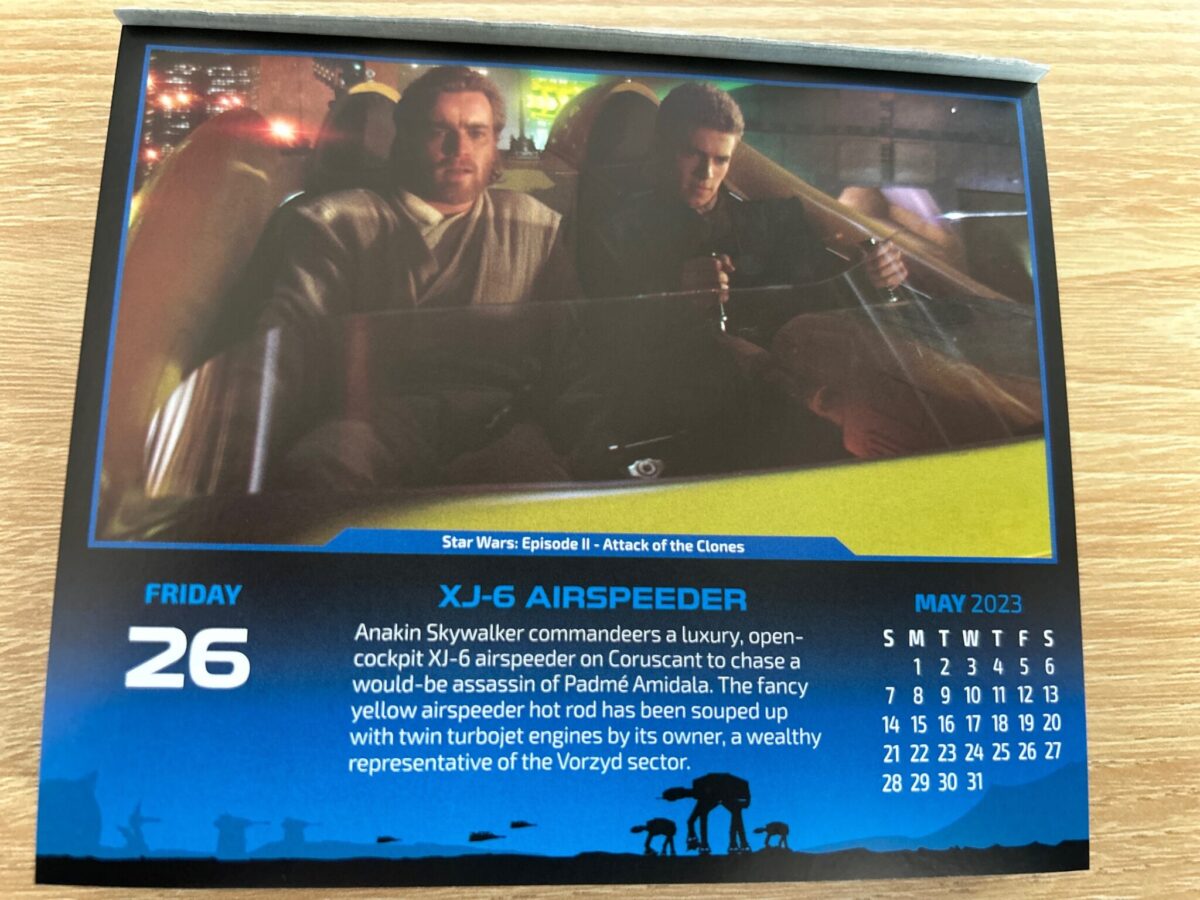 こんにちは。マスター・テッドです。 今日は5月26日 金曜日。 がんばって参りましょう。 本日のスター・ウォーズ カレンダー画像はこれ。 スター・ウォーズ:エピソードⅡ-クローンの攻撃よりXJ-6 エアスピーダー! Google翻訳によると Anakin Skywalker co...