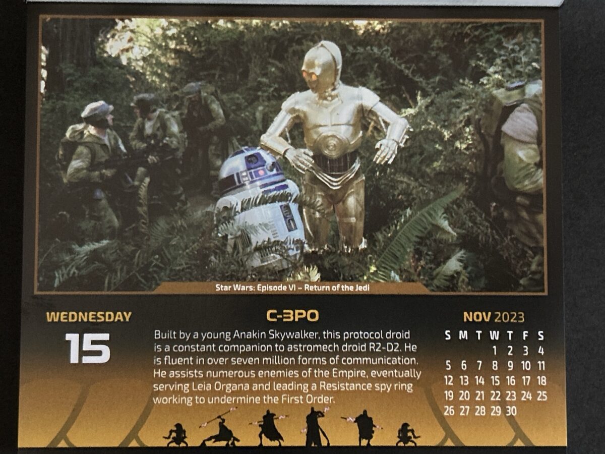 こんにちは。マスター・テッドです。 今日は11月15日 水曜日。 がんばって参りましょう。 本日のスター・ウォーズ カレンダー画像はこれ。 スター・ウォーズ:エピソードⅥ-ジェダイの帰還よりC-3PO! あああ!これぞスター・ウォーズ!ワタクシにとっては...