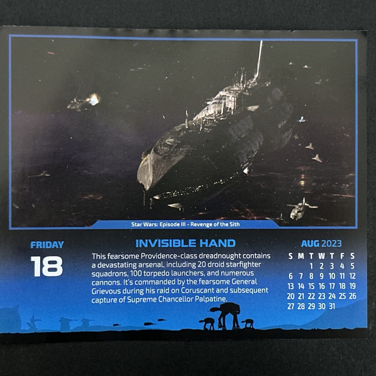 こんにちは。マスター・テッドです。 今日は8月18日 金曜日。 がんばって参りましょう。 本日のスター・ウォーズ カレンダー画像はこれ。 スター・ウォーズ:エピソードⅢ-シスの復讐よりインヴィジブル・ハンド! ポッキリ折れちゃう船ですね! プラモも高... -