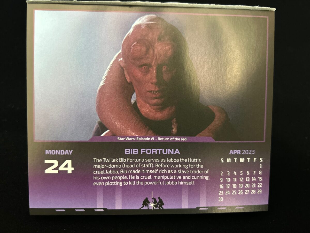こんにちは。マスター・テッドです。 今日は4月24日 月曜日。 がんばって参りましょう。 本日のスター・ウォーズ カレンダー画像はこれ。 スター・ウォーズ:エピソードⅥ-ジェダイの帰還よりビブ・フォーチュナ! Google翻訳によると The Twi'lek Bib Fort...