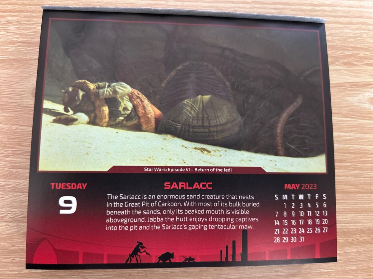 こんにちは。マスター・テッドです。 今日は5月9日 火曜日。 がんばって参りましょう。 本日のスター・ウォーズ カレンダー画像はこれ。 スター・ウォーズ:エピソードⅥ-ジェダイの帰還よりサルラック! Google翻訳によると The Sarlacc is an enormous sa... -