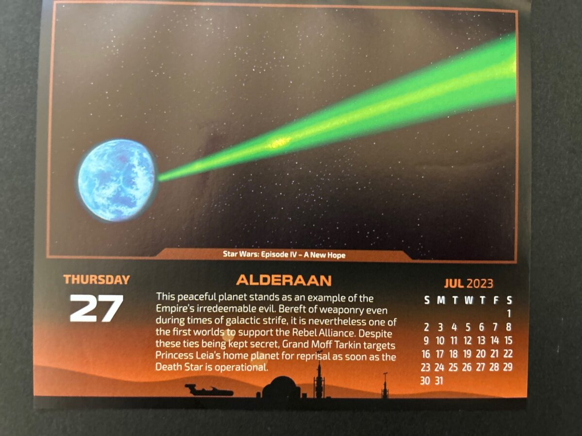 こんにちは。マスター・テッドです。 今日は7月27日 木曜日。 がんばって参りましょう。 本日のスター・ウォーズ カレンダー画像はこれ。 スター・ウォーズ:エピソードⅣ-新たなる希望よりオルデラン! よりによって破壊寸前のこの写真か・・・・・・。 オ... -