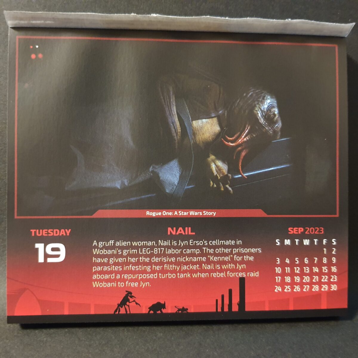 こんにちは。マスター・テッドです。 今日は9月19日 火曜日。 がんばって参りましょう。 本日のスター・ウォーズ カレンダー画像はこれ。 ローグ・ワン/スター・ウォーズ・ストーリーよりネイル! 昨日のボバ・フェットの華々しさから一転、なんとも地味... -