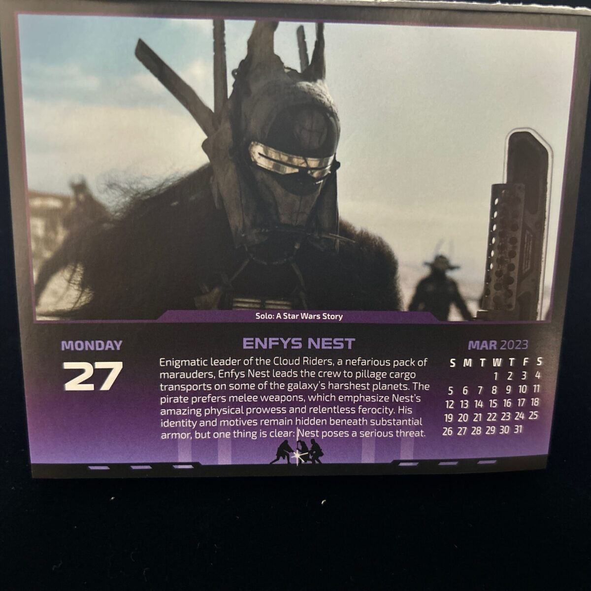 こんにちは。マスター・テッドです。 今日は3月27日 月曜日。 今週もがんばって参りましょう! 本日のスター・ウォーズ カレンダー画像はこれ。 ハン・ソロ/スター・ウォーズ・ストーリーよりエンフィス・ネスト! Google翻訳によると Enigmatic leader o... -