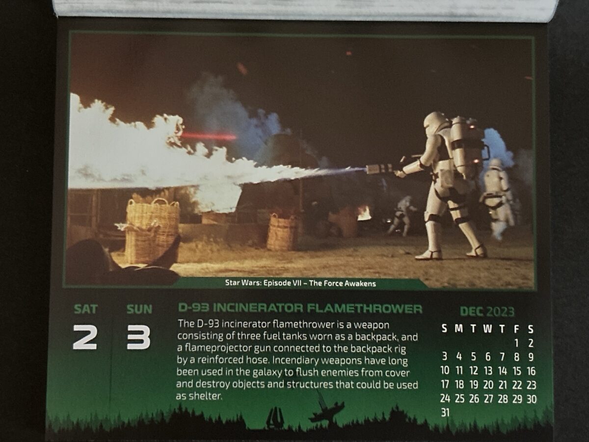 こんにちは。マスター・テッドです。 今日は12月2日 土曜日。明日3日の分も合わせて紹介だ! 週末もがんばって参りましょう。 今日のスター・ウォーズ カレンダー画像はこれ。 スター・ウォーズ:エピソードⅦ-フォースの覚醒よりD-93インシネレーター火炎... -
