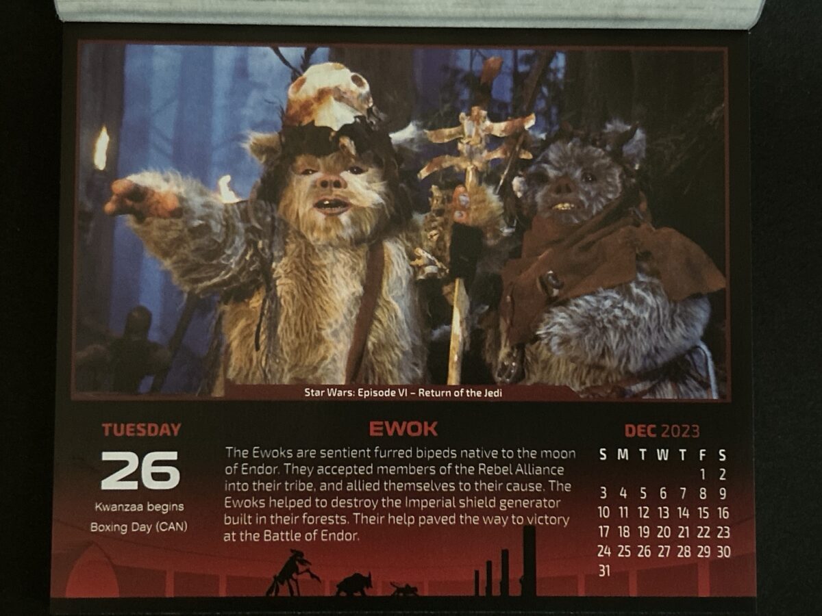 こんにちは。マスター・テッドです。 今日は12月26日 火曜日。 がんばって参りましょう。 本日のスター・ウォーズ カレンダー画像はこれ。 スター・ウォーズ:エピソードⅥ-ジェダイの帰還よりイウォーク! かわいいもの好きに人気のあるキャラクターですな... -