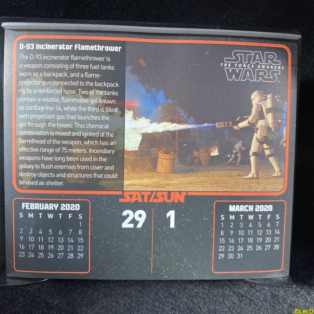 こんにちは。マスター・テッドです。 今日は2月29日 土曜日。明日1日の分も合わせて紹介だ! 週末もがんばって参りましょう。 今日のスター・ウォーズ カレンダー画像はこれ。 フォースの覚醒よりD-93インシネレーター火炎放射器! Google翻訳によると D-9... -