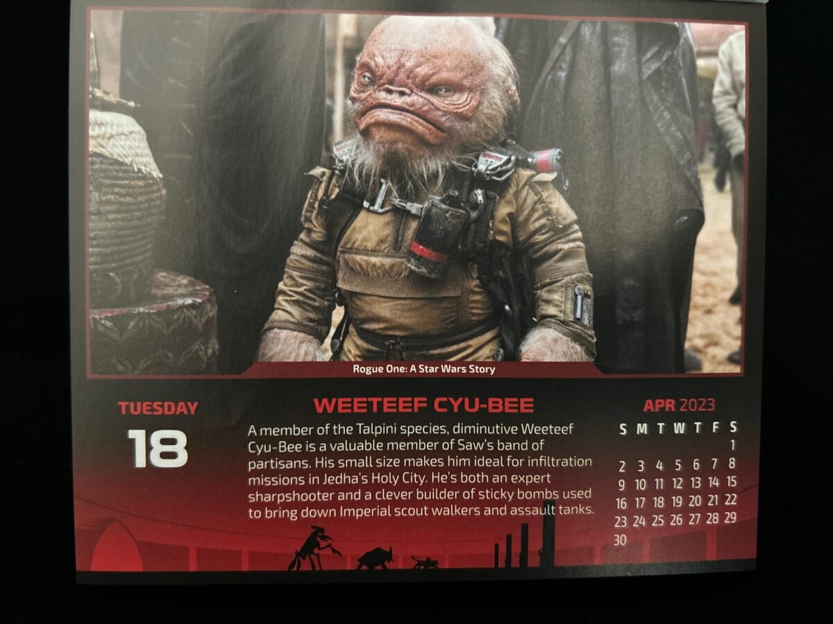 こんにちは。マスター・テッドです。 今日は4月18日 火曜日。 がんばって参りましょう。 本日のスター・ウォーズ カレンダー画像はこれ。 ローグ・ワン/スター・ウォーズ・ストーリーよりウィーティーフ・シユ=ビー! うっわ!また書きにくそうなキャラ... -