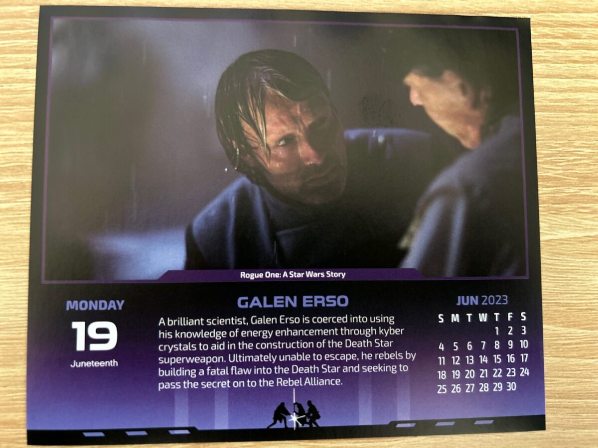 こんにちは。マスター・テッドです。 今日は6月19日 月曜日。 がんばって参りましょう。 本日のスター・ウォーズ カレンダー画像はこれ。 ローグ・ワン/スター・ウォーズ・ストーリーよりゲイレン・アーソ! Google翻訳によると A brilliant scientist, G... -