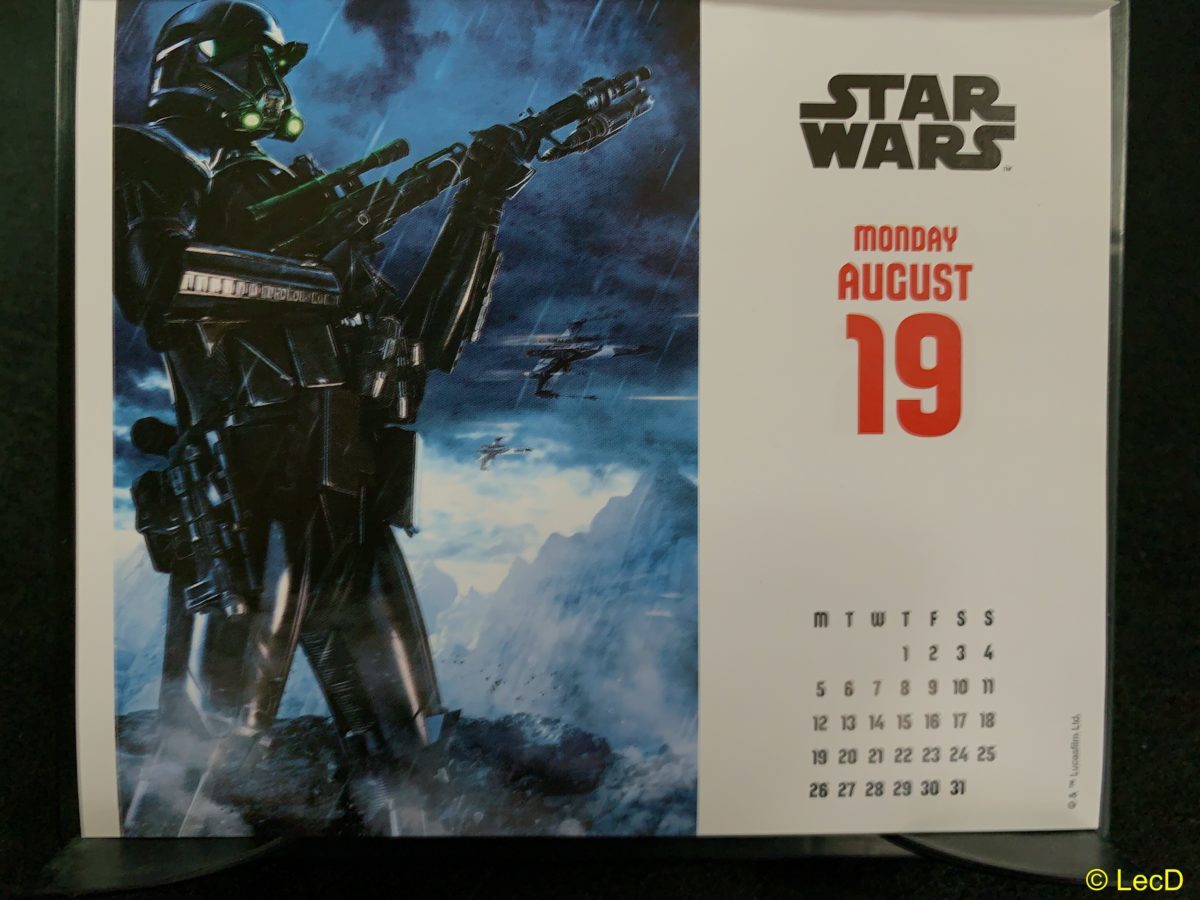 こんにちは。マスター・テッドです。 今日は8月19日 月曜日。 お盆休みも終わりましたな。 がんばって参りましょう。 今日のスター・ウォーズ カレンダー画像はこれ。 デス・トルーパー! かっこいいねえ。 雨の中だからきっとこ... -