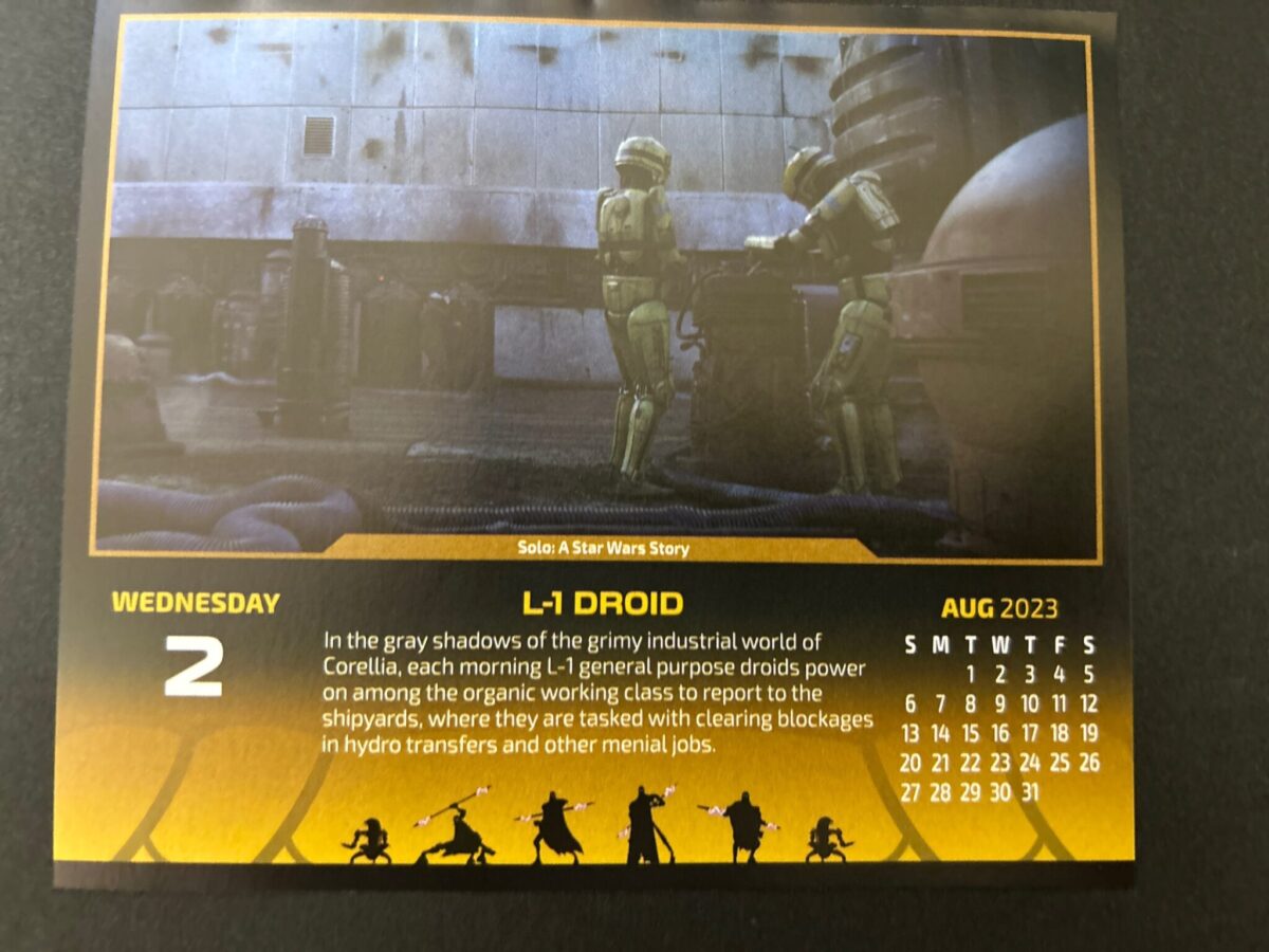 こんにちは。マスター・テッドです。 今日は8月2日 水曜日。 がんばって参りましょう。 本日のスター・ウォーズ カレンダー画像はこれ。 ハン・ソロ/スター・ウォーズ・ストーリーよりL-1 ドロイド! 写真見ればどのシーンか思い出せますが、こりゃまた地...