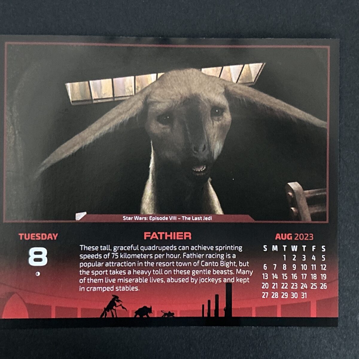 こんにちは。マスター・テッドです。 今日は8月8日 火曜日。 がんばって参りましょう。 本日のスター・ウォーズ カレンダー画像はこれ。 スター・ウォーズ:エピソードⅧ-最後のジェダイよりファジアー! これは商品化されてるのかな? されてても要らんけ... -