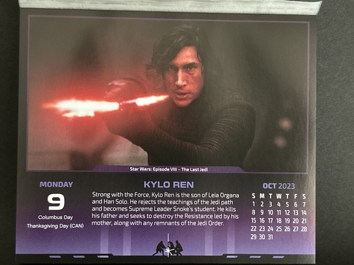 こんにちは。マスター・テッドです。 今日は10月9日 月曜日。体育の日でお休みですね。 くんちも最終日。 がんばって参りましょう。 本日のスター・ウォーズ カレンダー画像はこれ。 スター・ウォーズ:エピソードⅧ-最後のジェダイよりカイロ・レン! 大物...