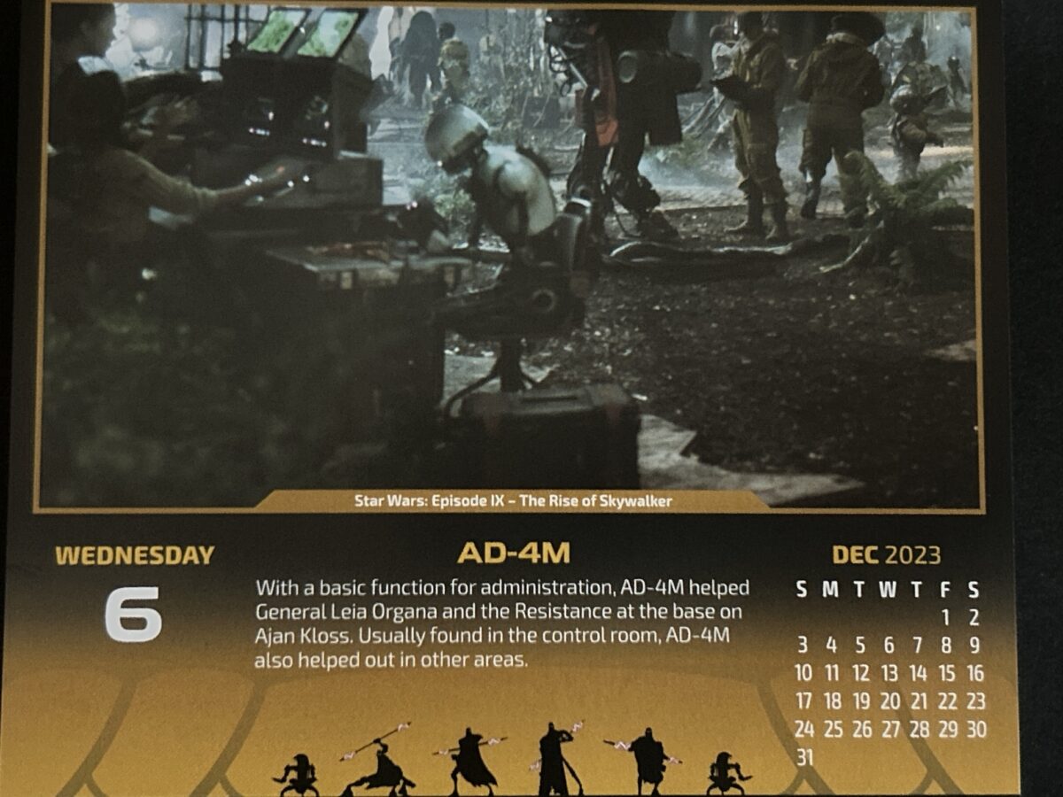 こんにちは。マスター・テッドです。 今日は12月6日 水曜日。 がんばって参りましょう。 本日のスター・ウォーズ カレンダー画像はこれ。 スター・ウォーズ:エピソードⅨ-スカイウォーカーの夜明けよりAD-4M! え~、こんなドロイド居たっけ。 全然記憶に... -