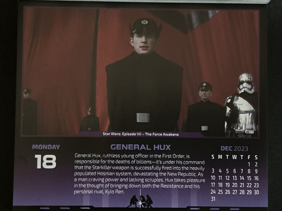 こんにちは。マスター・テッドです。 今日は12月18日 月曜日。 がんばって参りましょう。 本日のスター・ウォーズ カレンダー画像はこれ。 スター・ウォーズ:エピソードⅦ-フォースの覚醒よりハックス将軍! いわゆる、ハグス。青っちょろい奴。 フォース... -