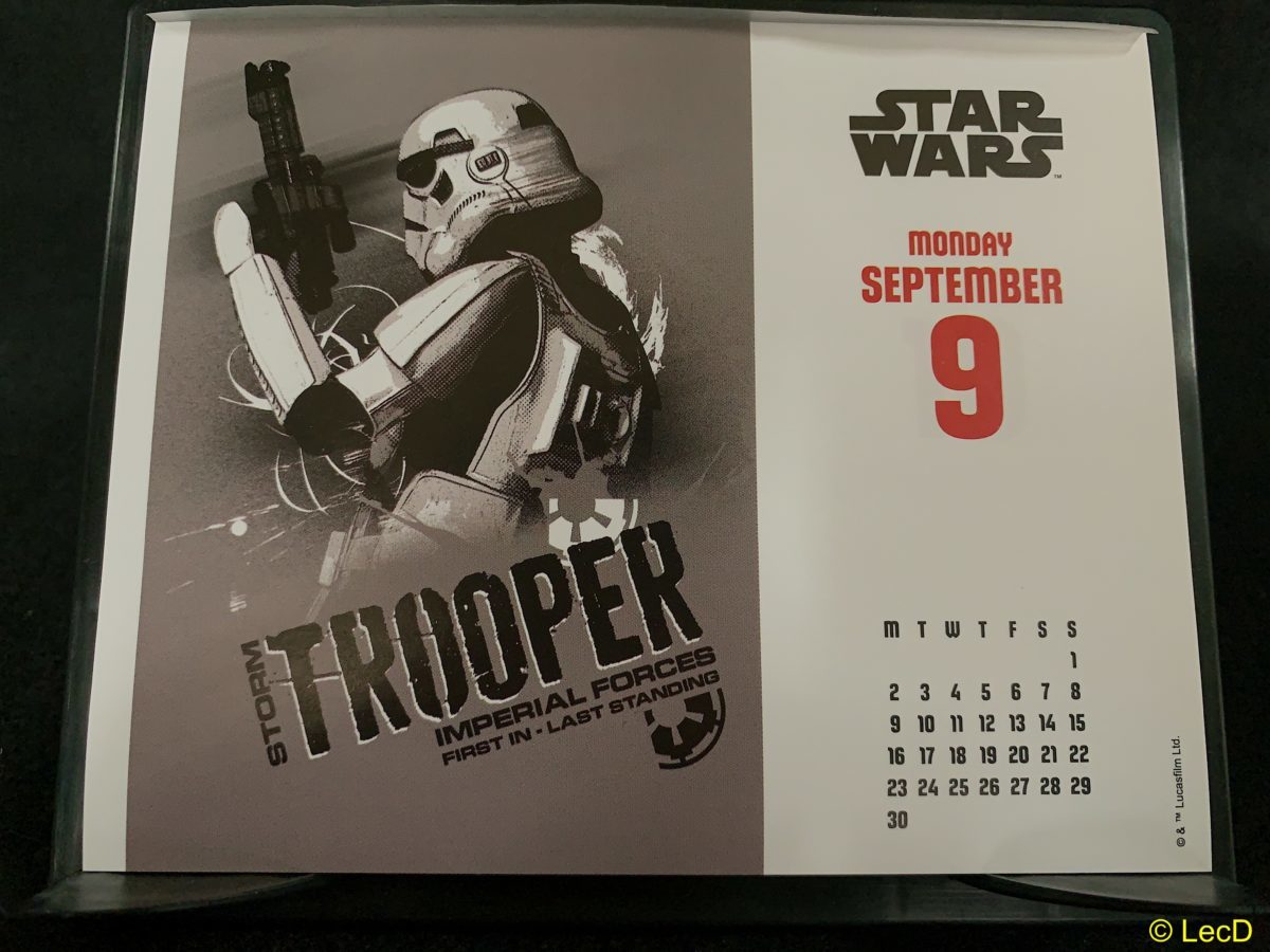 こんにちは。マスター・テッドです。 今日は9月9日 月曜日。 今週もがんばって参りましょう。 今日のスター・ウォーズ カレンダー画像はこれ。 ストームトルーパー! やたらカッコイイですね。 ヤラレ役なのに(笑) ザ・マンダロリアンでも活... -